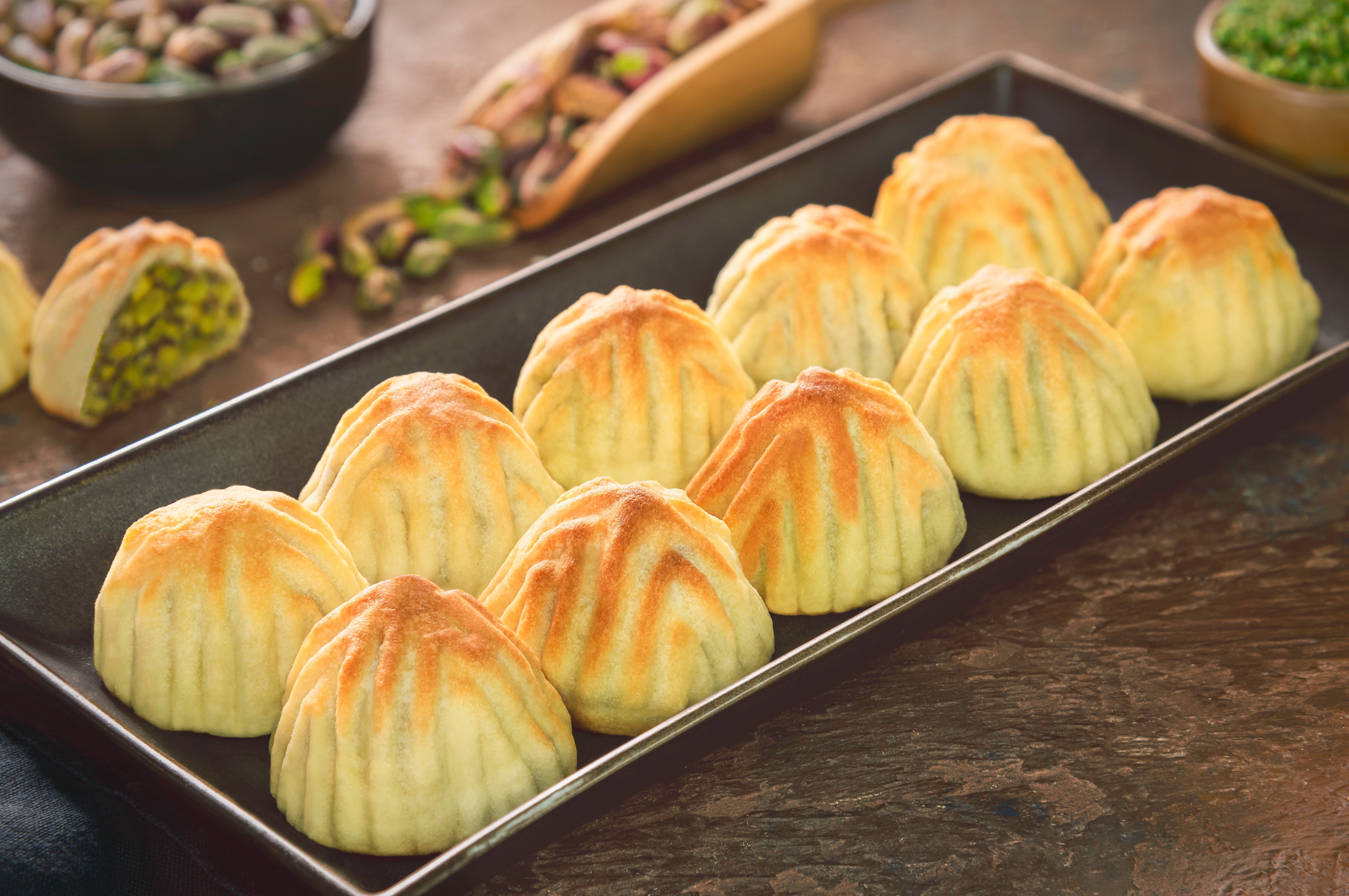 The pistachio filling is delicately sweet, with a subtle nuttiness that perfectly complements the buttery sweetness of the cookie dough. Each one is adorned with handcrafted designs that resemble pinched hands.