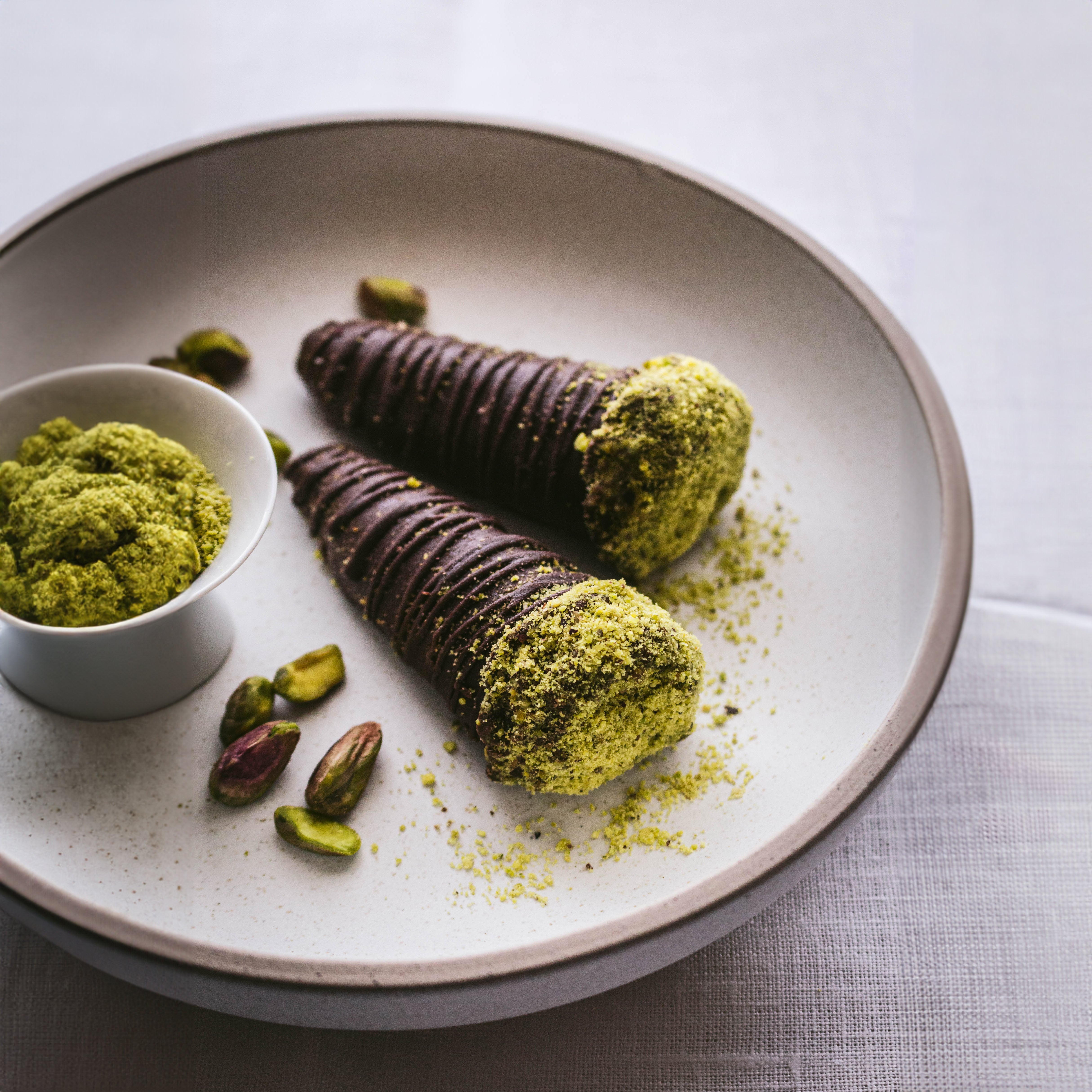 Indulge in one of our best-selling delights—elegantly flute-shaped cookies that captivate both the eyes and the palate. Each treat is filled with creamy pistachio, cloaked in rich chocolate, and crowned with a crunchy pistachio topping. This exquisite creation is a symphony of textures and flavors, making every bite an unforgettable experience.