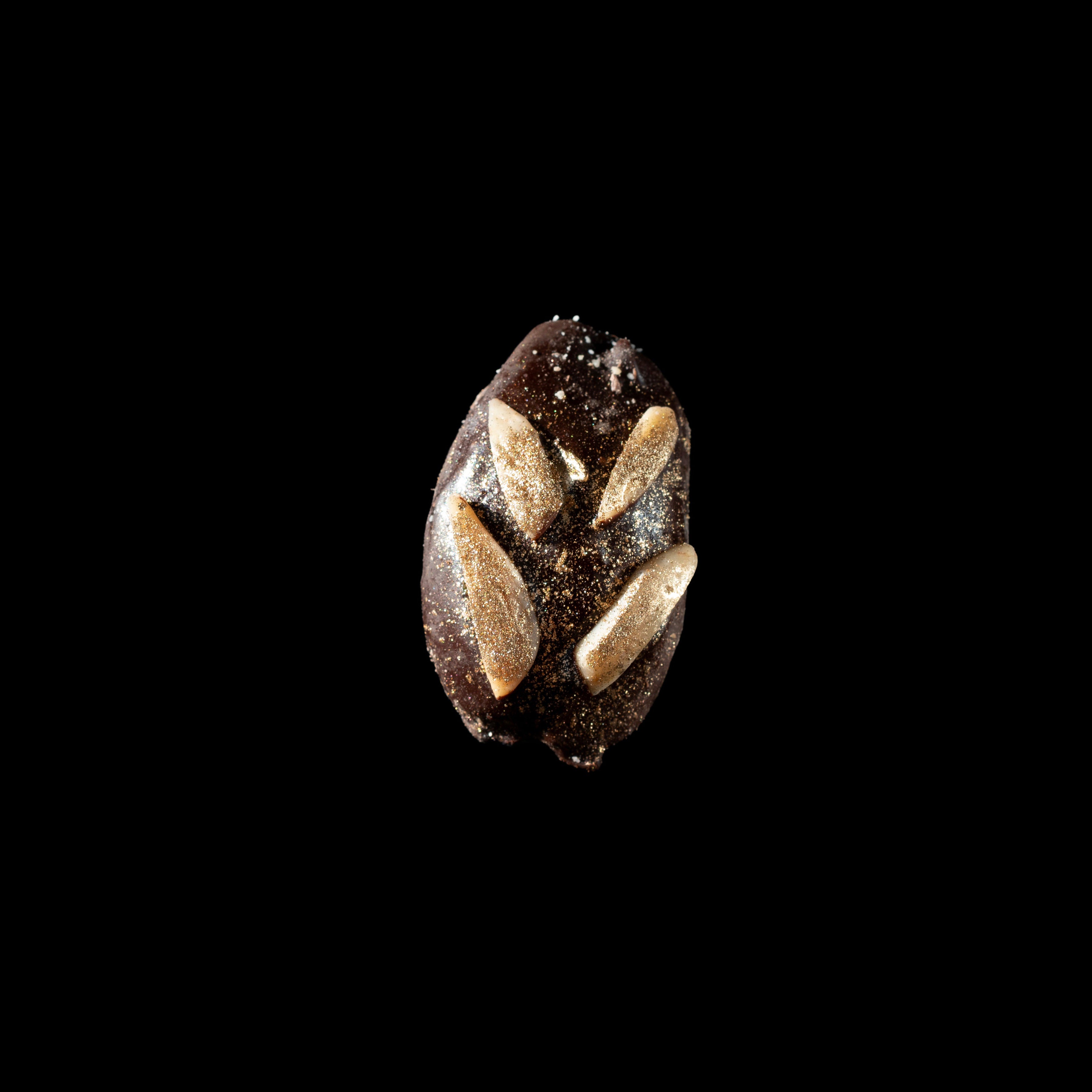 Roasted almonds, ground to perfection and wrapped in dark chocolate, topped with slivered almonds and a golden touch—pure indulgence in every bite.