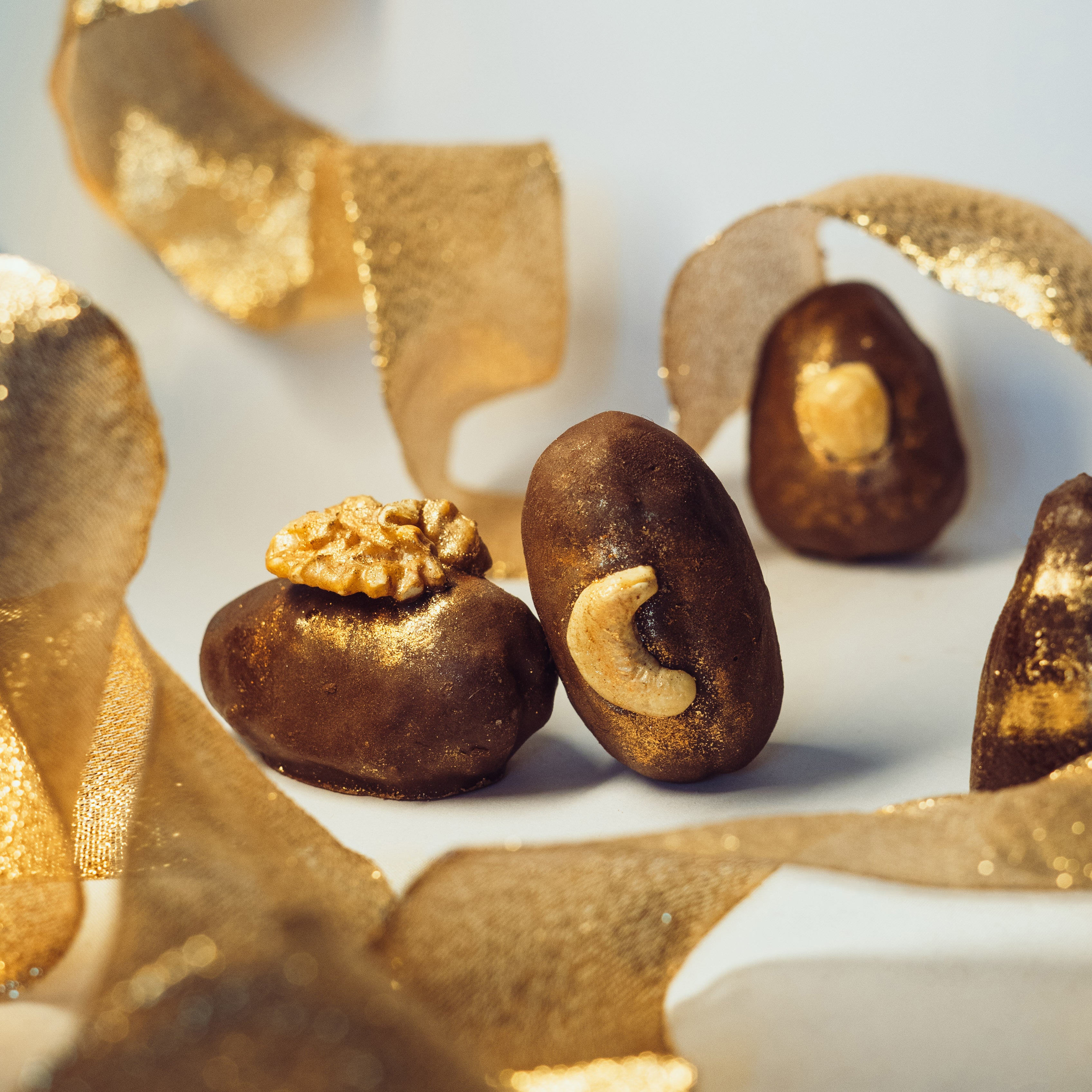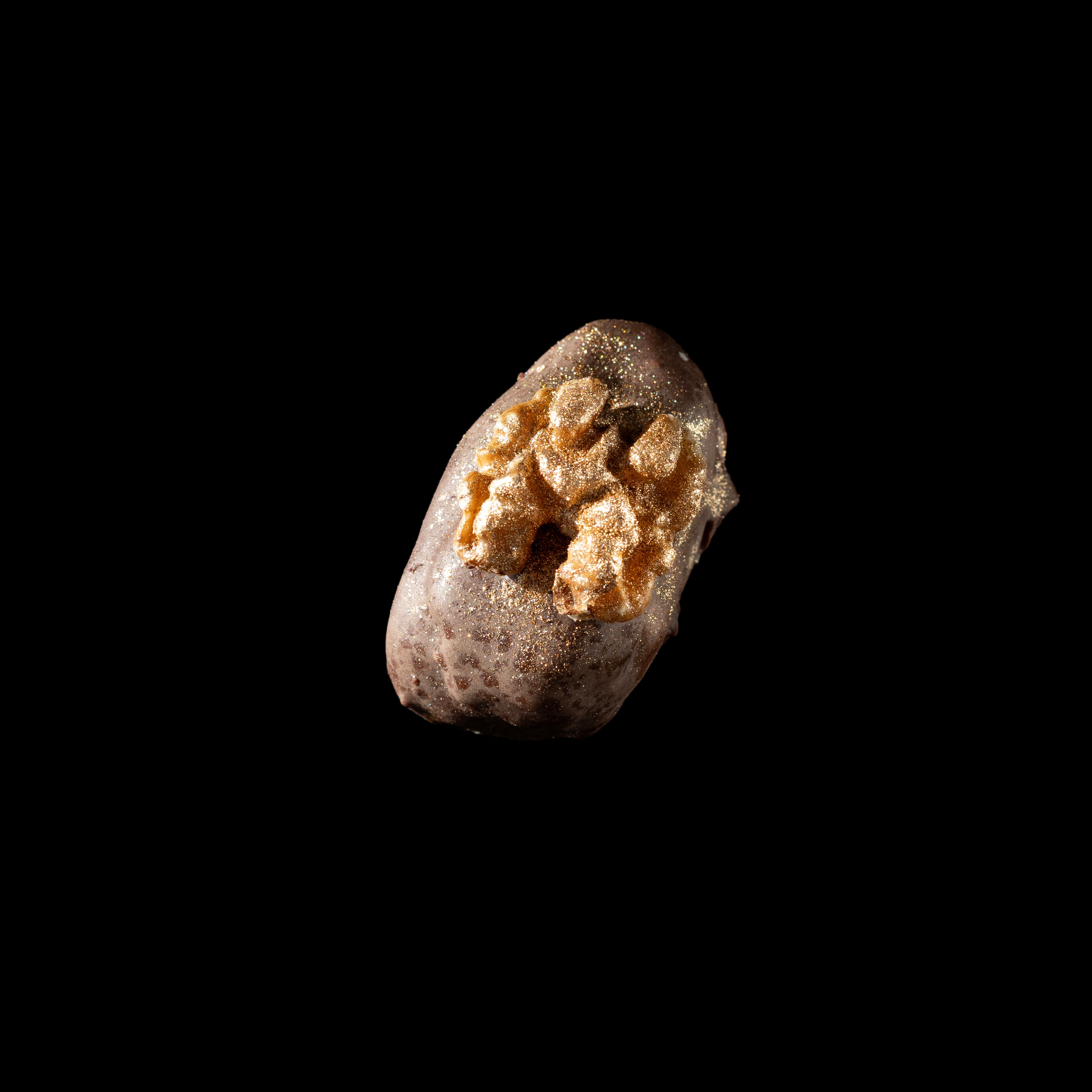 Delectable dates filled with walnut paste are dipped in a velvety pool of melted chocolate, then topped with a fresh walnut sprinkled with 24K gold dust—adding a satisfying crunch and a rich burst of nutty flavor.