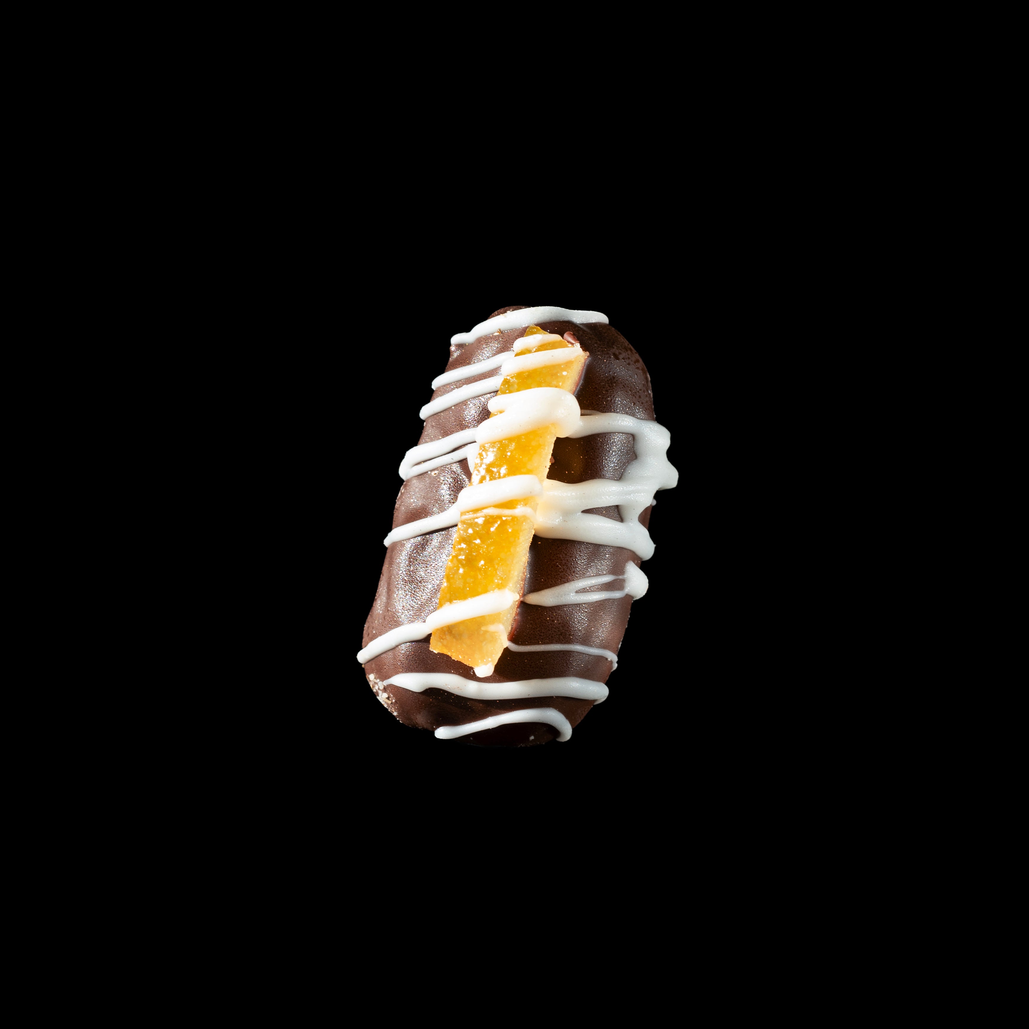 Chocolate-covered dates stuffed with orange peels and topped with additional strips of orange peels create a delightful fusion of sweet, citrusy, and indulgent flavors.