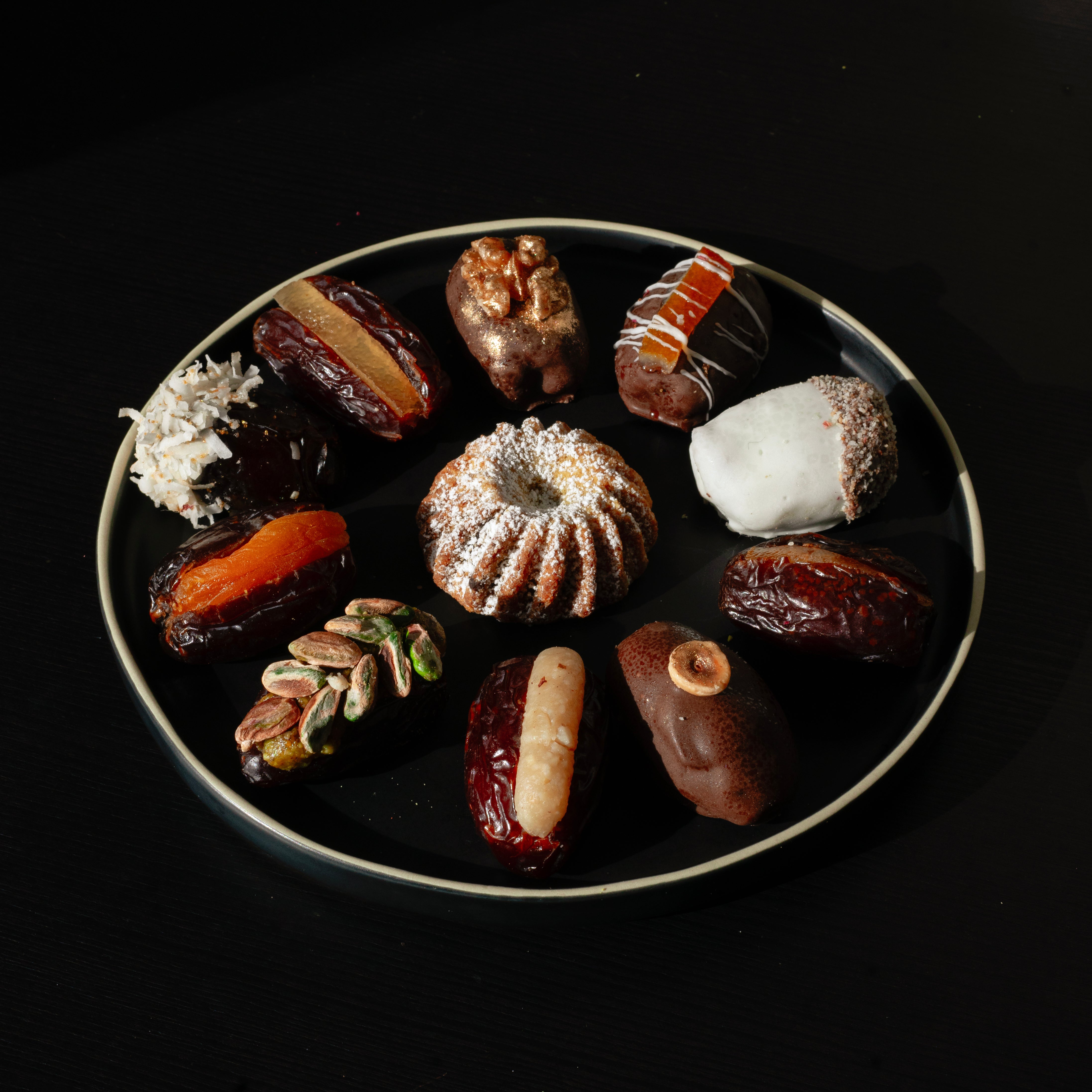 Dates filled with toasted coconut, cardamom, and saffron, topped with white chocolate and golden flakes—a delicate dance of flavor and elegance.