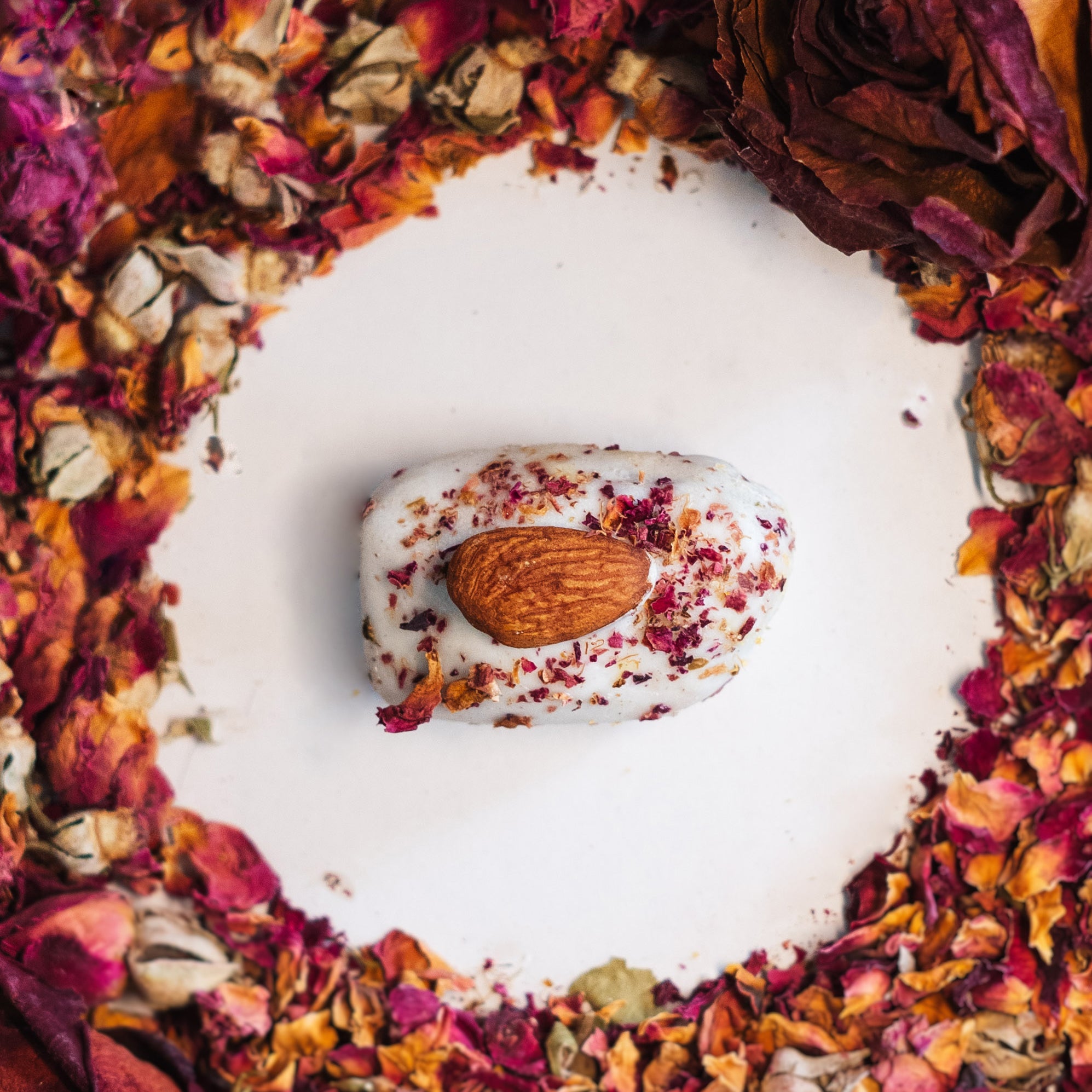 White chocolate-covered dates filled with roasted almonds and crowned with rose petals—an indulgence of creamy texture and floral elegance that delights the senses.