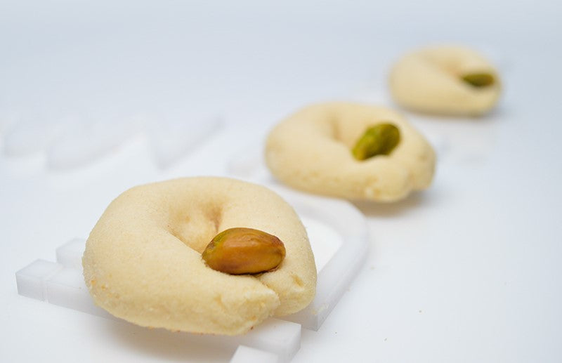 Embark on a sensory journey with our traditional Palestinian Ghraibah. Each bite unveils a symphony of flavors and textures – a crisp outer shell gently yielding to a buttery, melt-in-your-mouth center. Crafted from the finest flour, sugar, and ghee, these delectable shortbread cookies are more than just a treat; they're a celebration of Palestinian culinary heritage. And as a final touch, they're adorned with a sprinkle of vibrant, fresh pistachio, adding a delightful crunch and a burst of color. Perfect for every occasion, these Ghraibah are a testament to the artistry of Palestinian baking