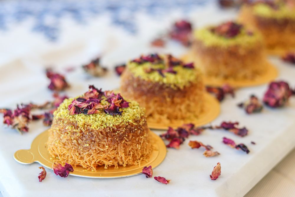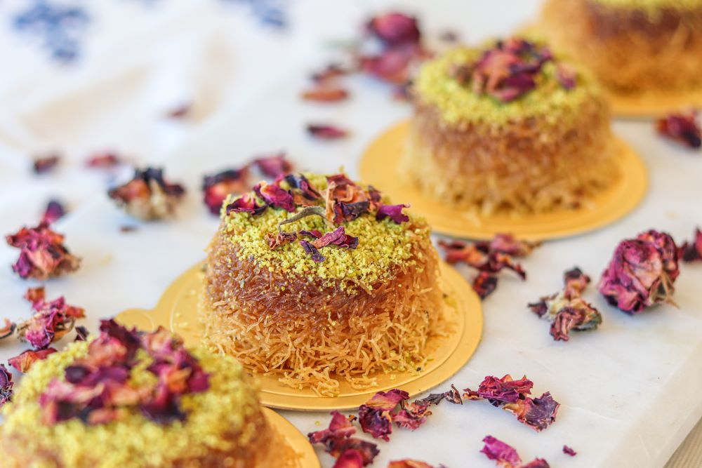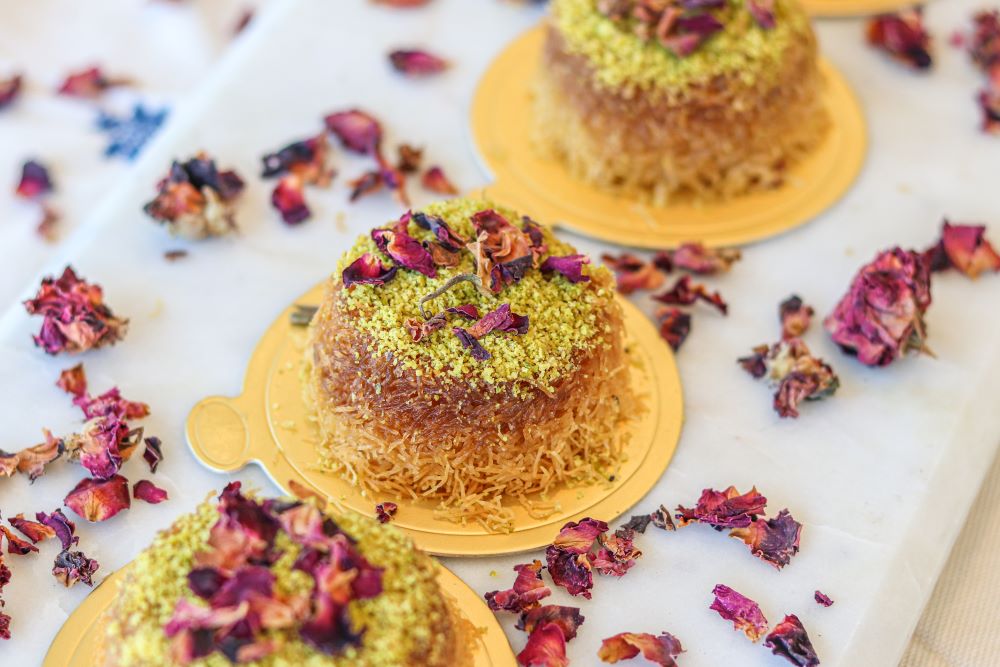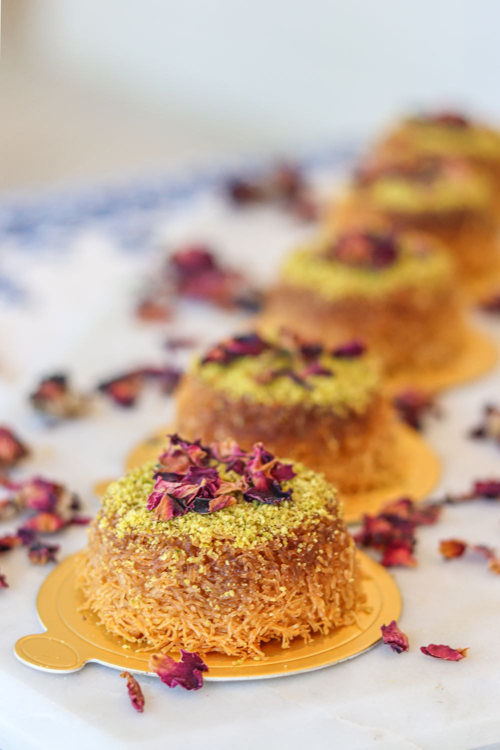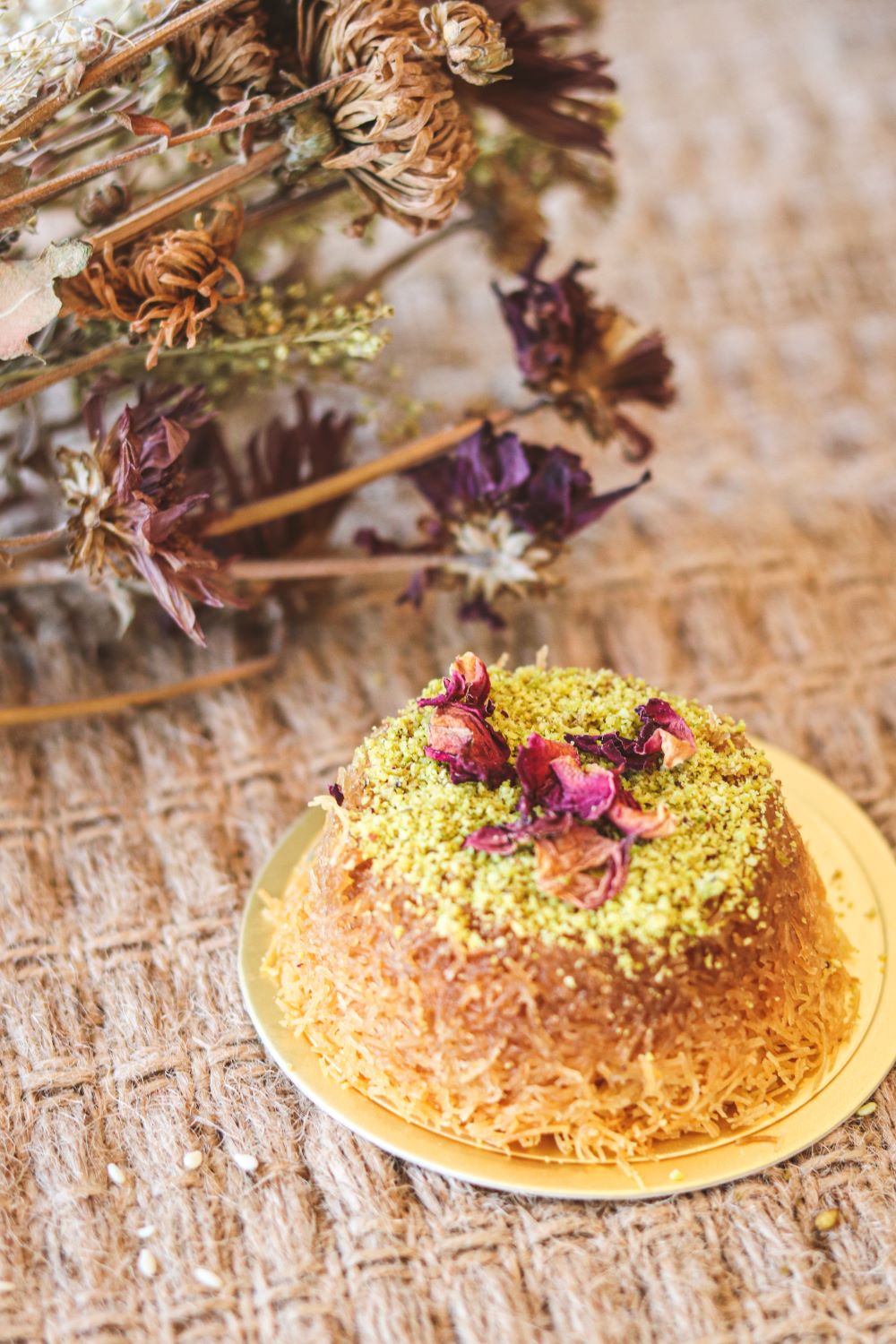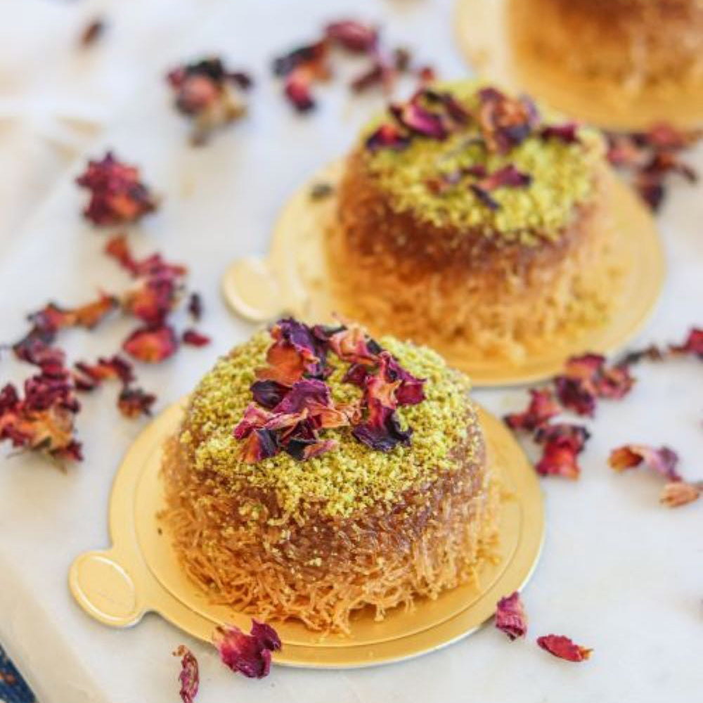 Experience a taste of the exotic with our homemade delight! Cream and cheese intertwine, baked to a golden hue and bathed in a fragrant sugar syrup infused with orange blossom water. Topped with a sprinkle of chopped pistachios and delicate rose petals, each bite is a journey through the enchanting flavors of the Middle East.