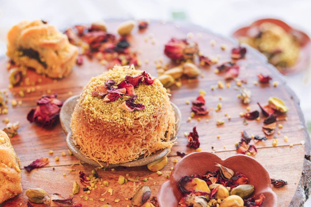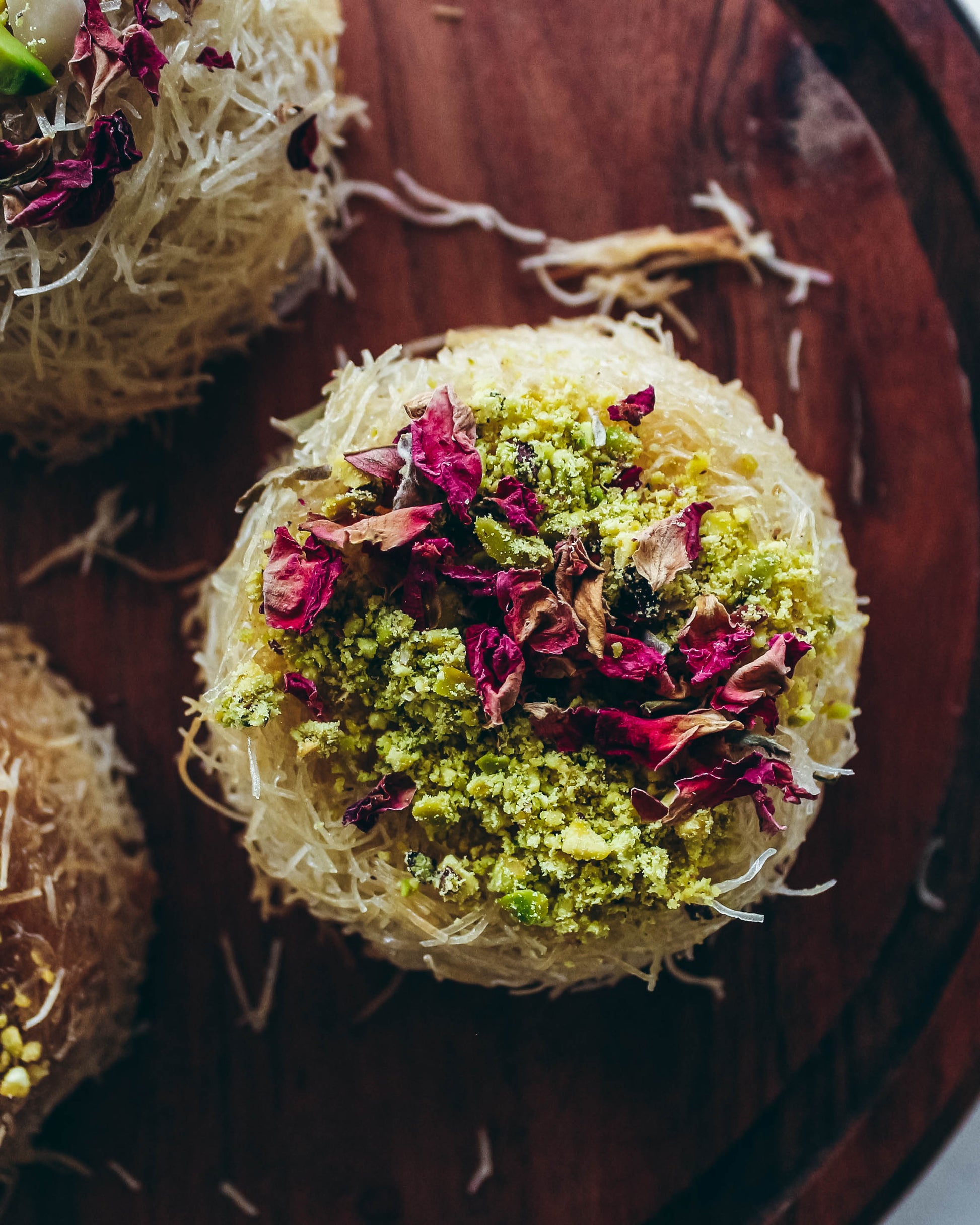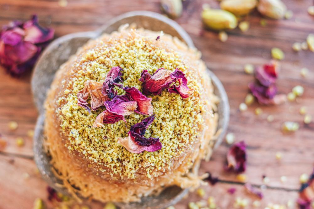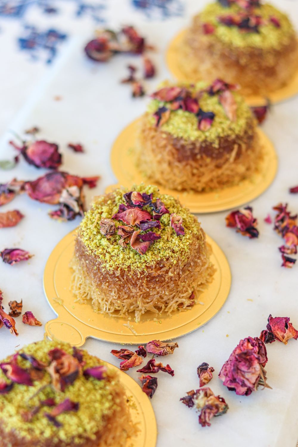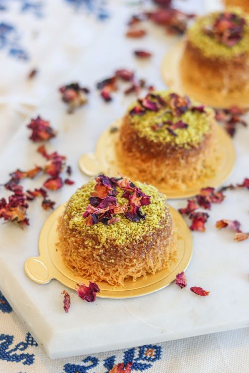 Experience a taste of the exotic with our homemade delight! Cream and cheese intertwine, baked to a golden hue and bathed in a fragrant sugar syrup infused with orange blossom water. Topped with a sprinkle of chopped pistachios and delicate rose petals, each bite is a journey through the enchanting flavors of the Middle East.
